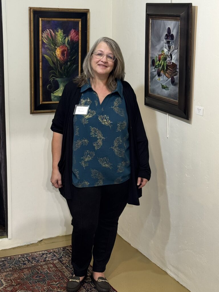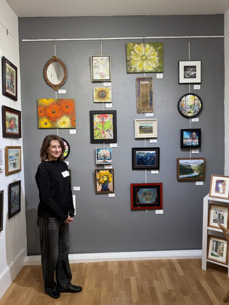 ART DU JOUR FEATURED GUEST ARTIST VERONICA THOMAS IN THE ART VAULT AND THE SMALL WORKS COLLECTION (ORIGINAL ART PRICED AT $200 OR LESS) ON THE GREY WALL.